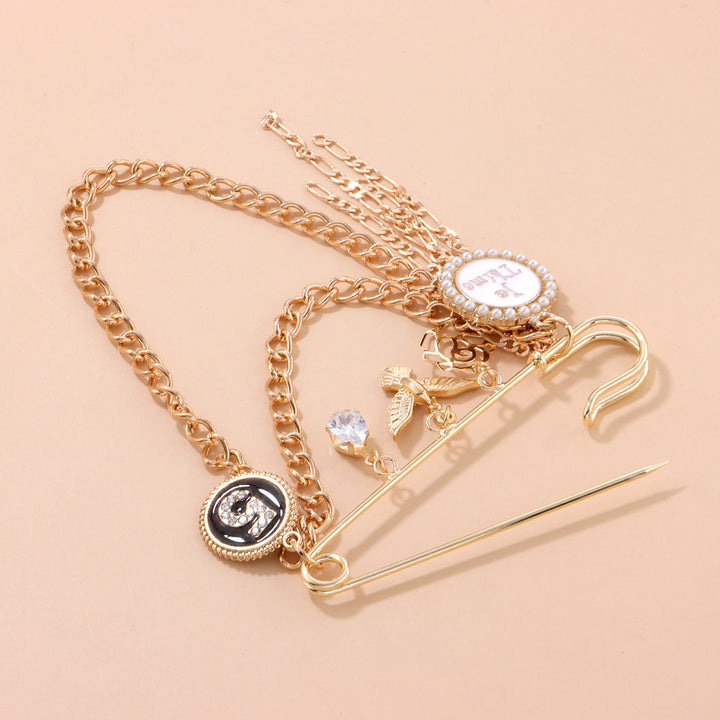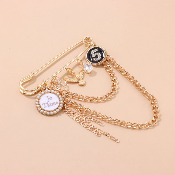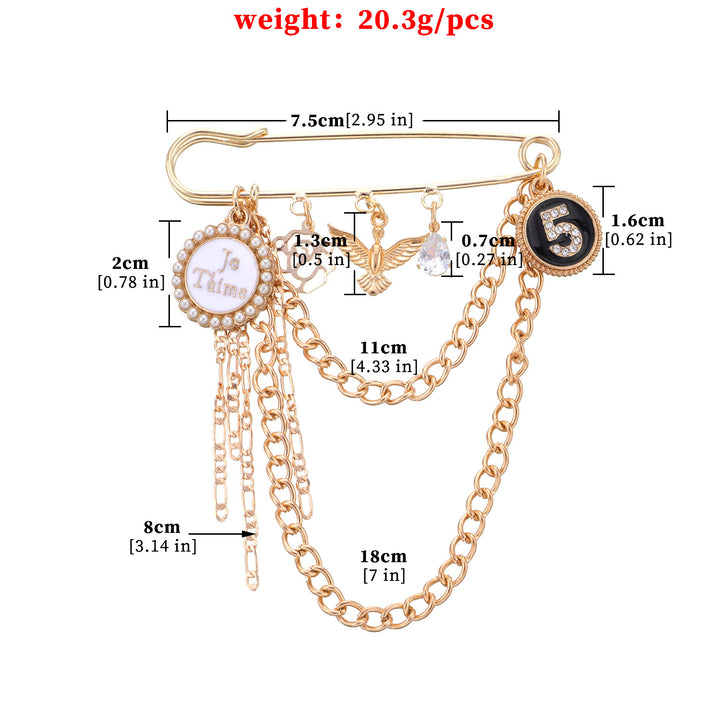 European And American Cross-Border Jewelry Pearl Disc Full Diamond Number 5 Brooch Punk Retro Exaggerated Chain Pin Accessories